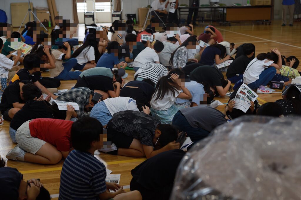 「今、震度5の地震が起こったらどうしますか?」という問いかけに、子どもたちはすぐに体を低くして頭を守る姿勢に。