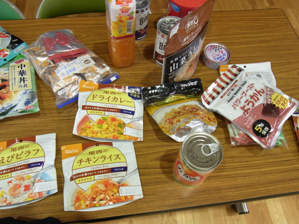 定番のカンパンや缶詰から、うどんやようかん、スープ、コーヒーなど多彩な食べ物が机の上にずらり。