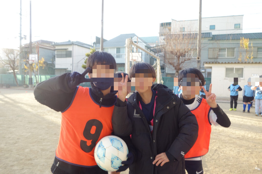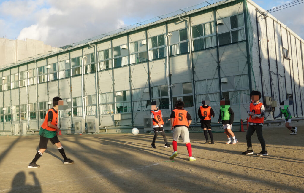 シュートやドリブル、パス回しの練習の後、チームに分かれて練習試合を行います。