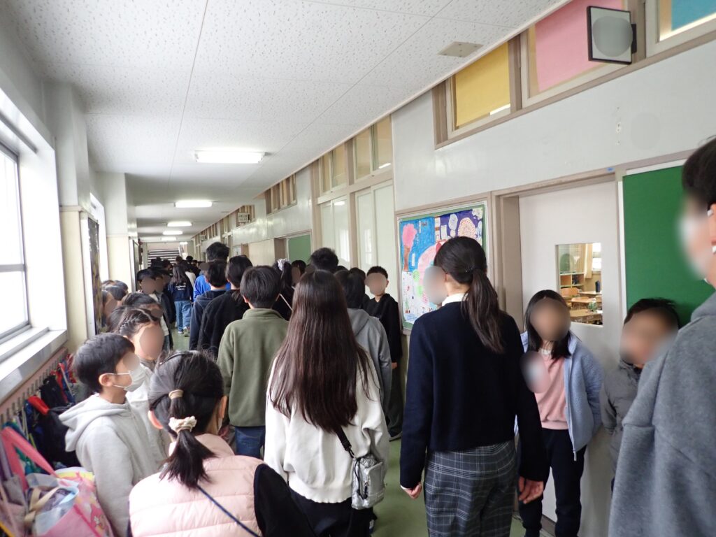 まずは6年生が1〜4年生の全ての教室前を巡りながら歩いて体育館へ向かいます。