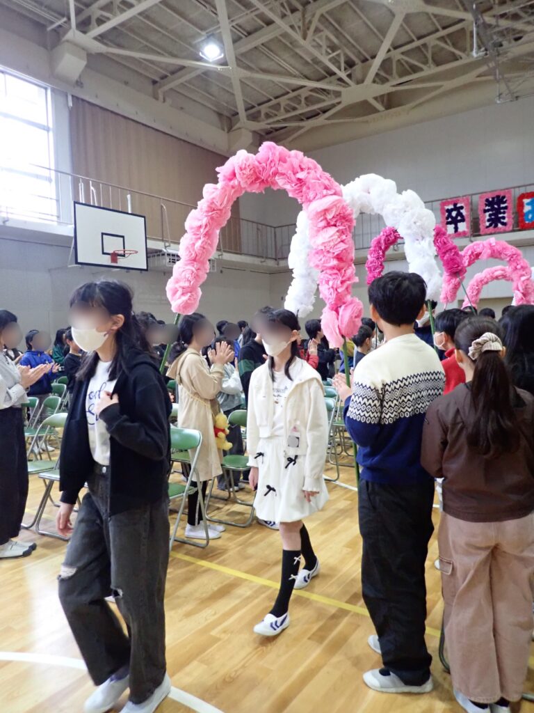 退場のときも、6年生は5年生の作る花のアーチをくぐり抜けて行きます。会場には、あたたかな拍手が響いていました。
