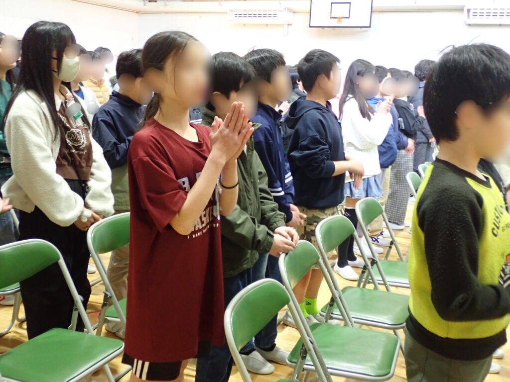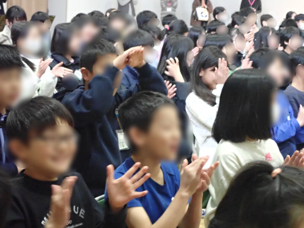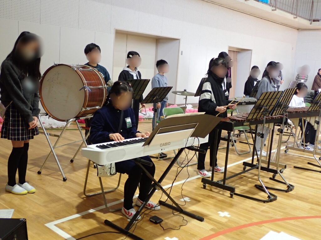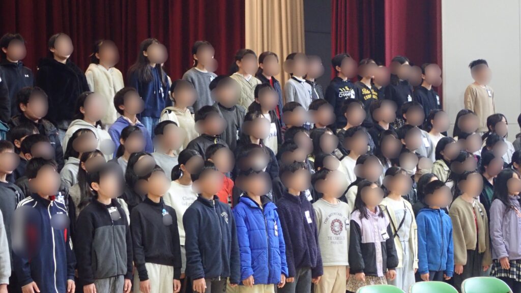 体育館には、澄んだ歌声がやさしく広がりました。伴奏は自らやりたいと申し出てくれた5年生が担当しています。ピアノや木琴、打楽器が心地よく重なります。途中には5年生全員での手拍子や足拍子も入り、会場は一体感に包まれます。