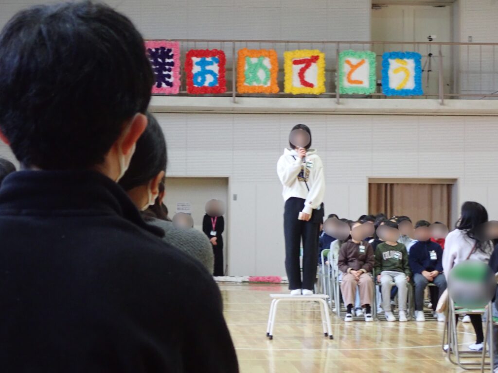 6年生代表からのお礼の言葉と来年度へ向けてのエールが伝えられました。続いて、5年生代表からの感謝とはなむけの言葉。いよいよ本当に巣立ちの時が近づいていると感じる瞬間でした。