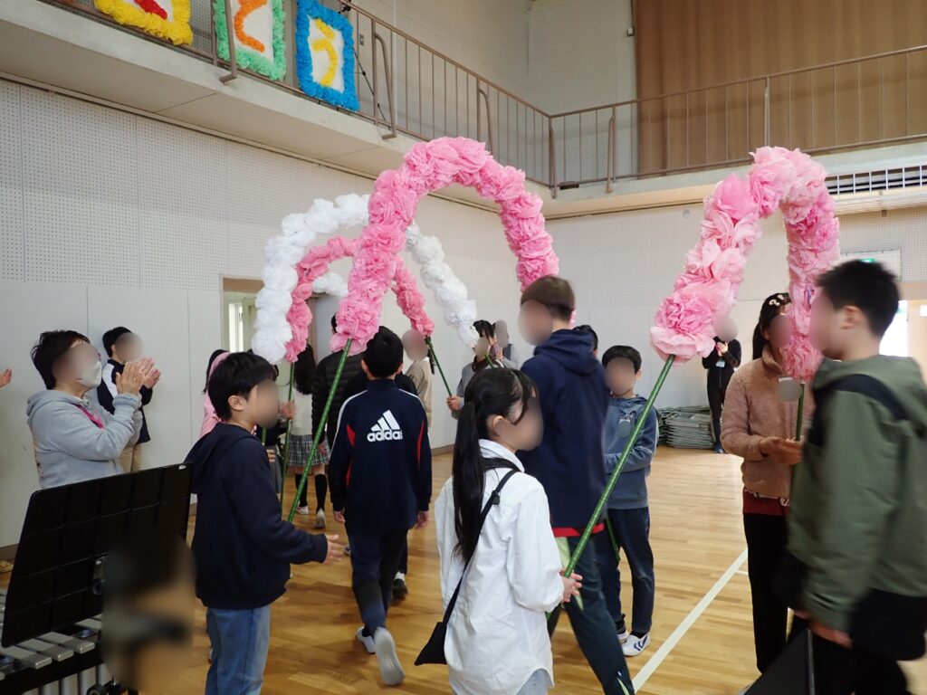入り口には、5年生が作った幾重にも重なるお花のアーチ。
